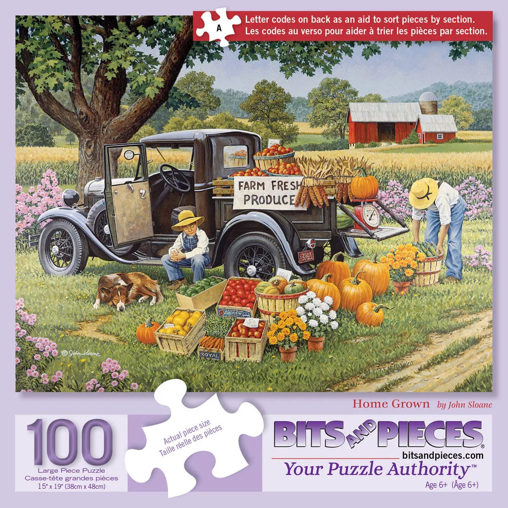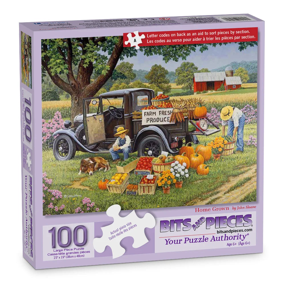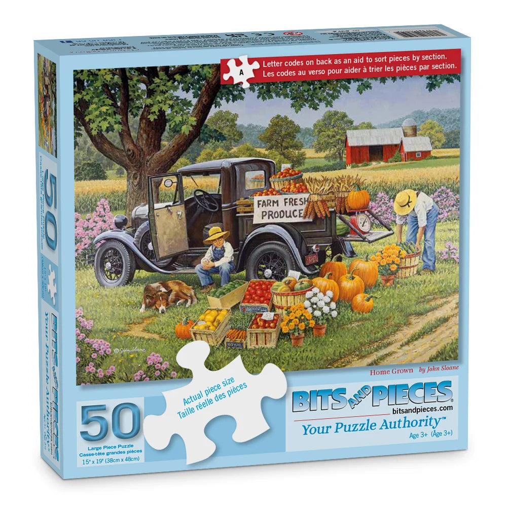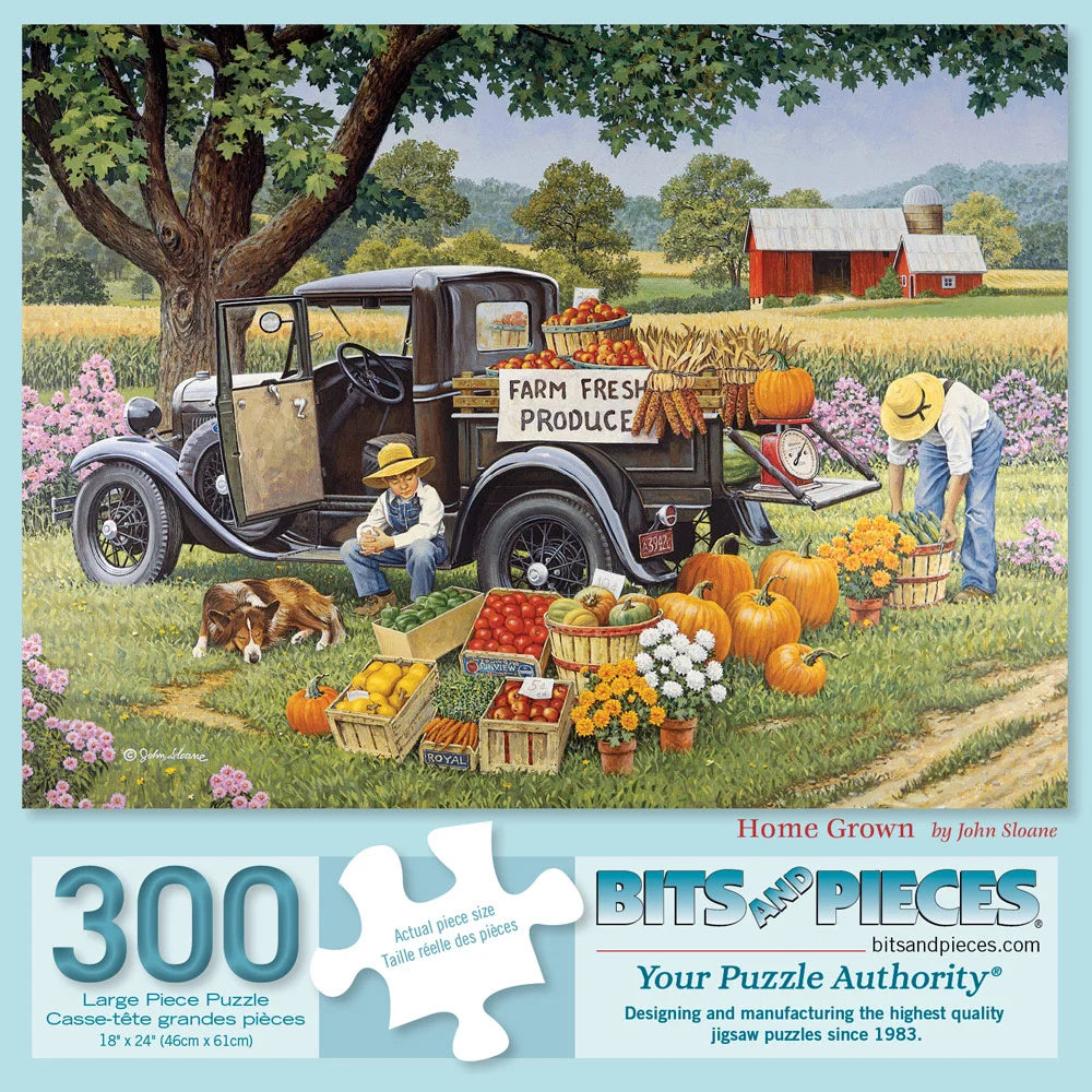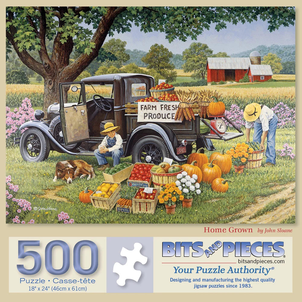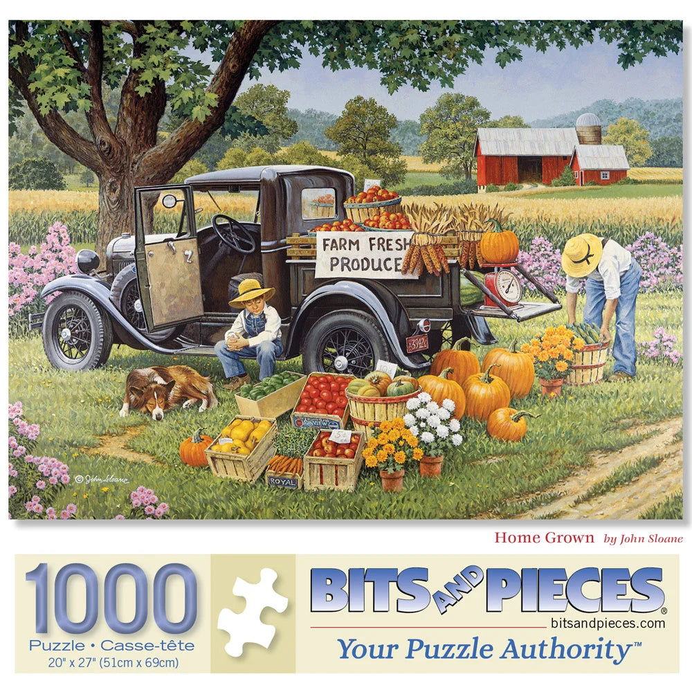 This jigsaw puzzle is designed by John Sloane and available in multiple piece counts. Amidst a rustic countryside backdrop, a vintage black truck laden with a bounty of fresh produce, including pumpkins, apples, carrots, and corn, beckons to passersby. By the truck's side, a loyal dog keeps watch as a father unloads the harvest, all against the picturesque backdrop of a proud red barn, evoking a heartwarming, idyllic scene.
