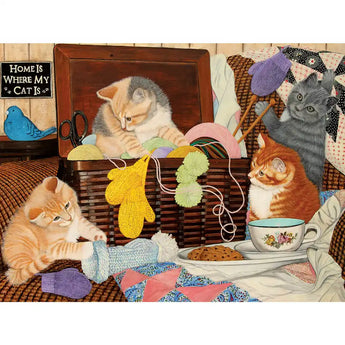 Bring cozy charm to your puzzle table with this 500-piece jigsaw puzzle by Julie Bauknecht. A basket of yarn becomes the ultimate playground for curious kittens, surrounded by mittens, quilts, tea, and cookies. With warm textures, playful cats, and a sweet sign reading “Home is where my cat is,” this scene is perfect for cat lovers and crafters alike. Measures 18" x 24" when complete.
