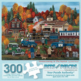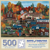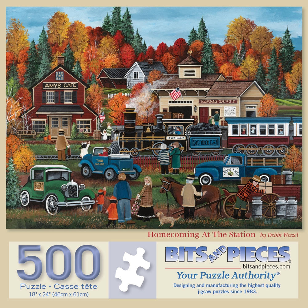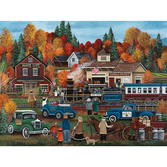 Celebrate the beauty of fall with this captivating puzzle by Debbi Wetzel. Available in 300 and 500-piece counts, this scene beautifully captures the essence of a bustling train station in autumn.The image features a picturesque train station set against a backdrop of vibrant fall trees, their leaves showcasing a stunning array of warm hues. A charming train pulls into the station, where an array of classic cars, people, and a horse-drawn buggy are waiting in anticipation. Debbi Wetzel’s detailed and inviting portrayal of this autum to your home.