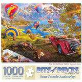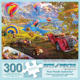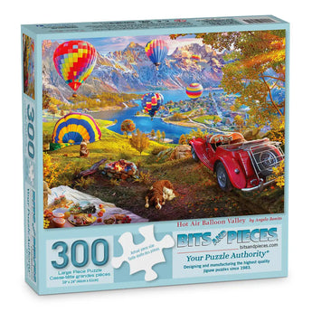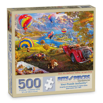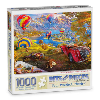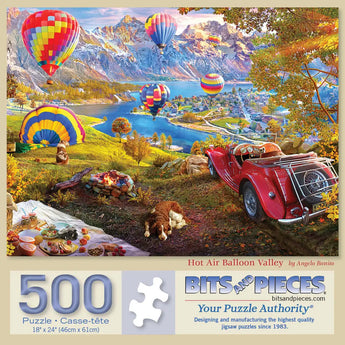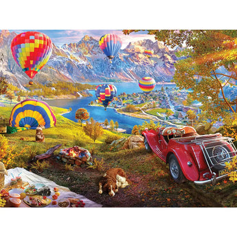 Step into a world of wonder with Hot Air Balloon Valley by Angelo Bonito. This breathtaking puzzle invites you to soar above a peaceful valley, where vivid hot air balloons glide gracefully against a backdrop of towering mountains and a glistening lake. The scene bursts with warmth and charm—autumn leaves ablaze, a vintage red car parked near a campfire, and a loyal pup resting nearby. Every detail tells a story of serenity and adventure. Let this captivating scene transport you to a world of tranquility and beauty! Bring this serene adventure to life, one puzzle piece at a time!