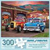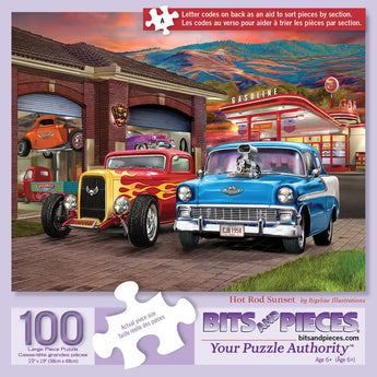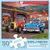Ignite your passion for classic Americana with this vibrant puzzle. Created by the renowned Bigelow Illustrations, this tableau is a revved-up homage to the golden era of hot rods, where chrome gleams and engines roar against the backdrop of a fiery sunset. Each piece slots together to form a scene bursting with the nostalgia of a 1950s service station, complete with polished vintage cars ready to cruise the open road.