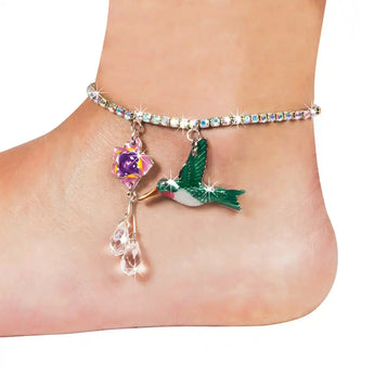Our Hummingbird Anklet features a charming enamel hummingbird and vibrant hibiscus, accented with two teardrop crystal dangles. All are suspended by an elastic band of even more iridescent crystals. One size fits most. Hummingbird is 2" wide.
