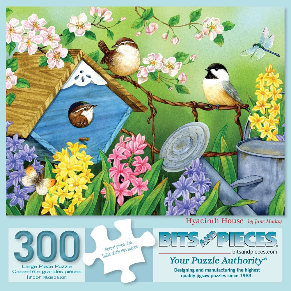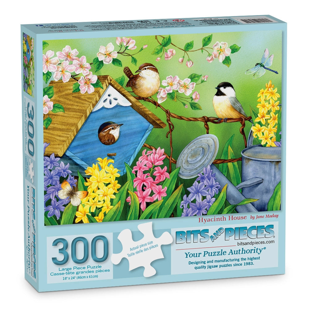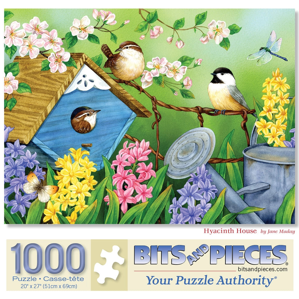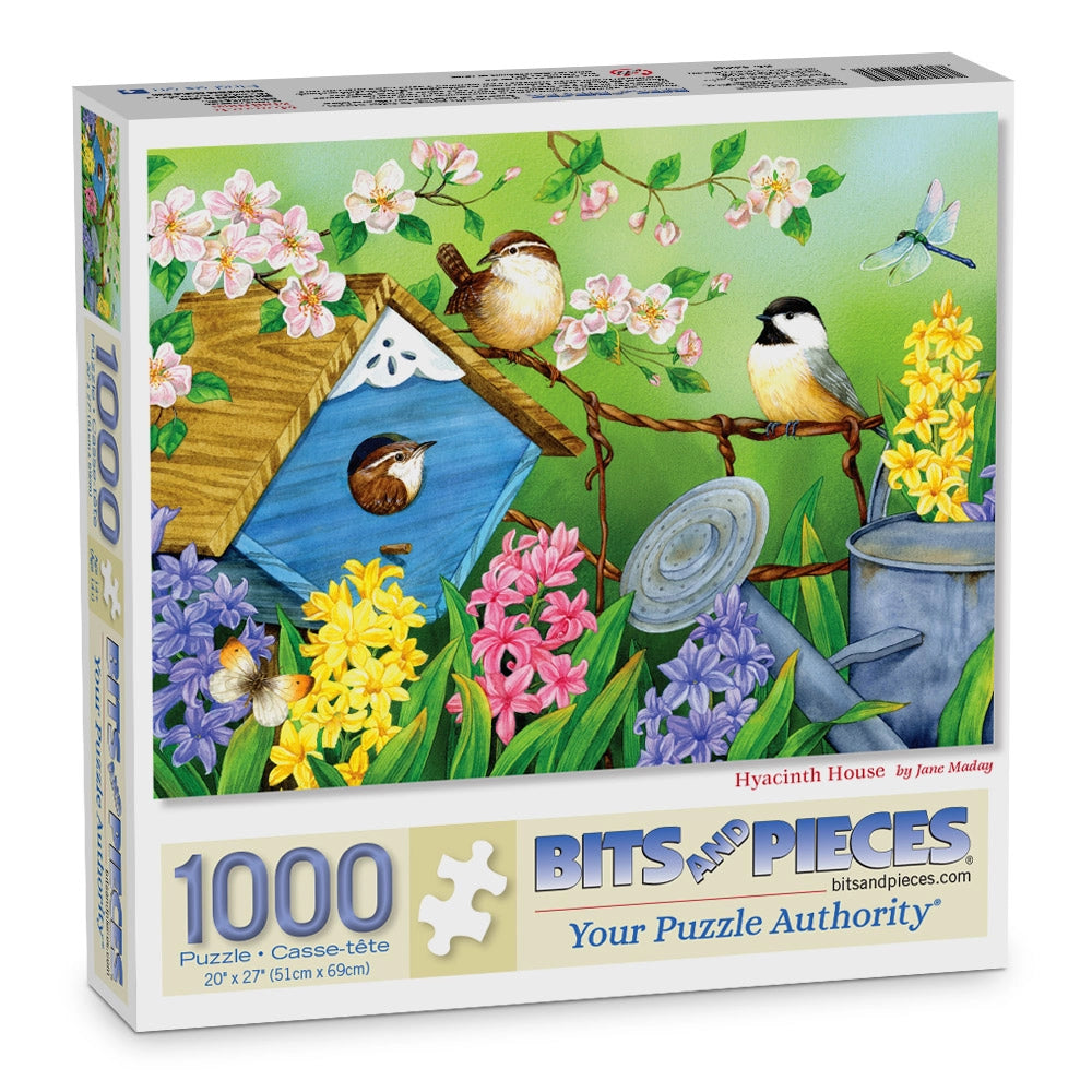 In Hyacinth House by Jane Maday, chickadees gather around a blue birdhouse tucked into a bed of daisies and lavender hyacinths. Butterflies float nearby as soft petals sway in the breeze. This feel-good jigsaw puzzle is packed with spring colors and backyard charm.