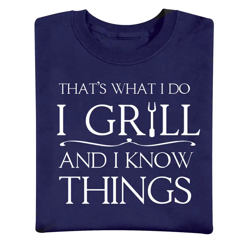 Command the grill (and the punchlines) with the That’s What I Do: I Grill and I Know Things T-shirt. This witty navy unisex tee is made from 100% soft cotton for breathable comfort whether you're flipping burgers, smoking ribs, or just supervising with a spatula in hand. Bold white lettering delivers the perfect mix of confidence and humor for every BBQ king or queen. Ideal for cookouts, Father's Day, or gifting your favorite pitmaster, this shirt lets everyone know who runs the backyard.