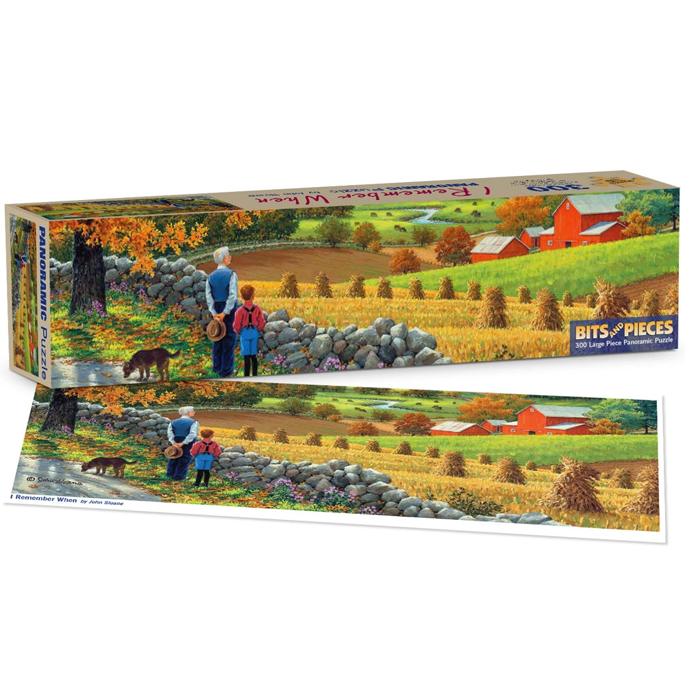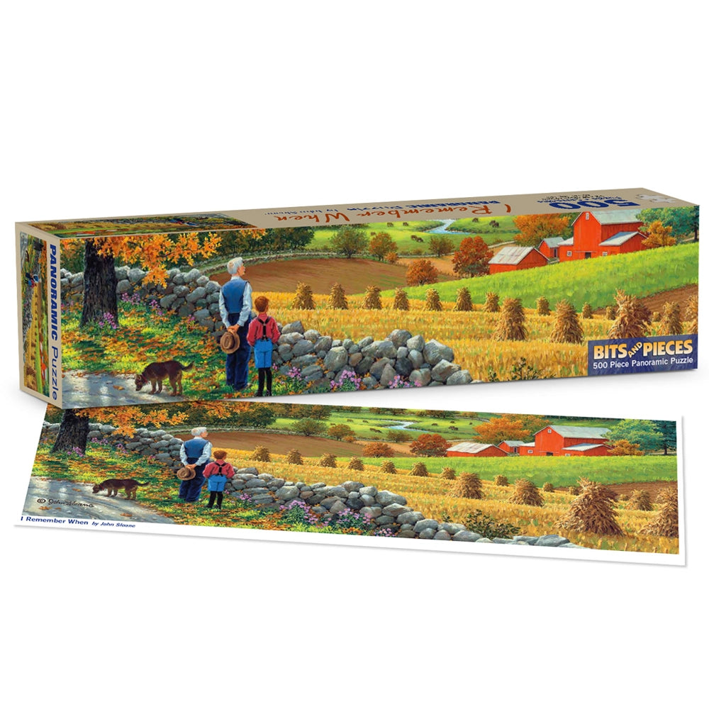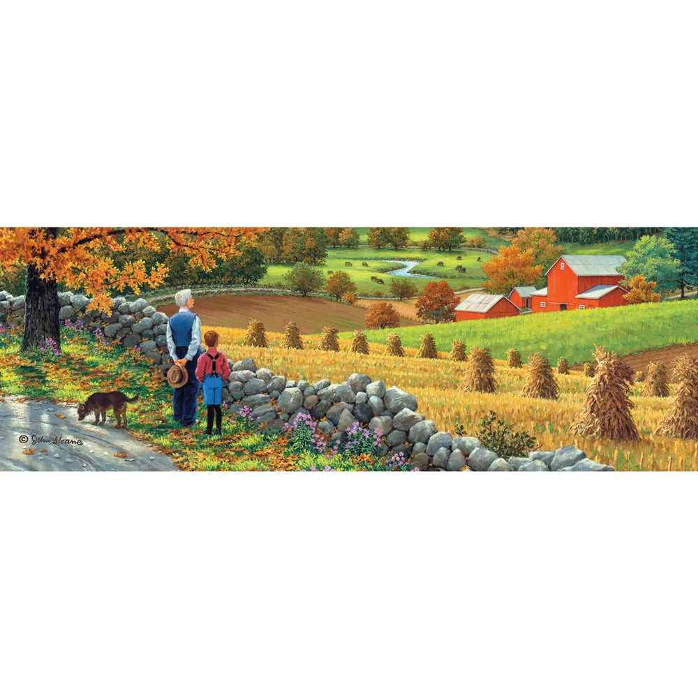 I Remember When by John Sloane uses a panoramic format to tell a story of rural nostalgia. An older couple and their dog walk beside a stone wall, gazing over golden fields, red barns, and the colorful trees of autumn. The wide view captures the peace and beauty of country life in this vibrant jigsaw puzzle.