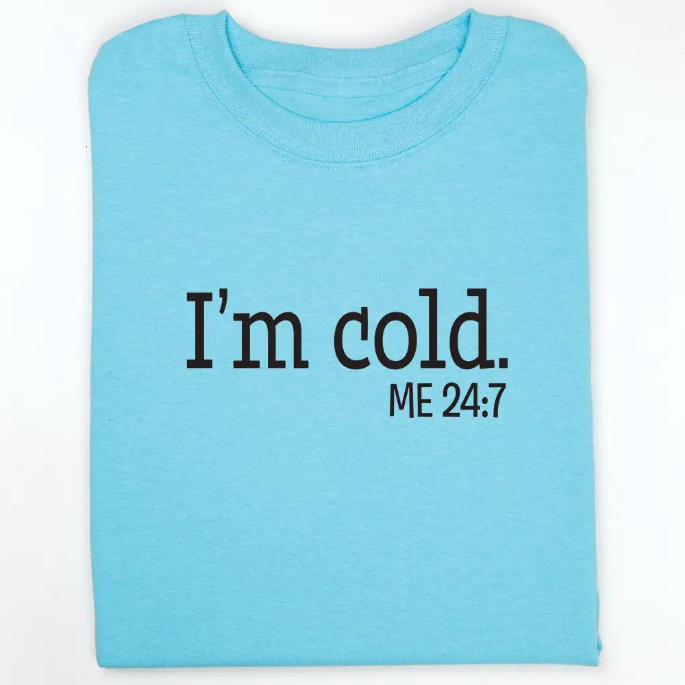 Embrace the chill (and the humor) with the I’m Cold Me 24:7 T-shirt — the ultimate graphic tee for those who are always just a little too cold. This short-sleeved, sky-blue crew neck features bold charcoal lettering that says what you’re already thinking. Cozy, clever, and effortlessly relatable, it’s perfect for lounging at home, running errands, or layering up for warmth. Whether you’re gifting it or grabbing one for yourself, this tee delivers laughs—even if your fingers are still frozen.