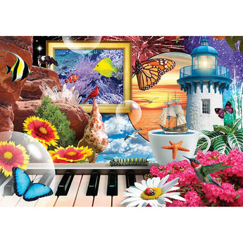This 1000-piece jigsaw puzzle is designed by Alan Giana and measures 19" x 27". A collage of colorful ideas bouncing around including fish, butterflies, and a lighthouse.