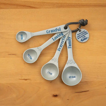 This four-piece set of measuring spoons ensures that everything you make is made with love! This collection of measuring spoons is looped together with a pendant that reads "We believe in one another, in this family, and the presence of God in this home." Each measuring spoon has a one-word mantra. This sweet set makes a sentimental housewarming gift or present for your favorite baker. Handwash only. Not microwave or dishwasher safe.
