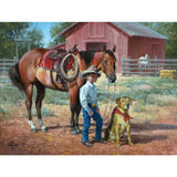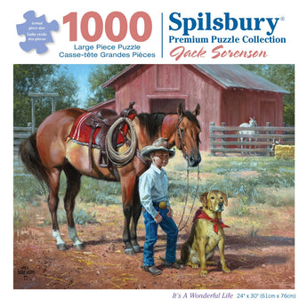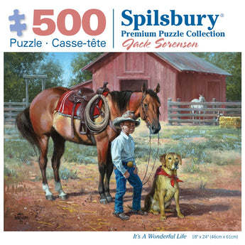 Step into a nostalgic countryside scene with It’s A Wonderful Life, a 500-piece puzzle by Jack Sorenson. Measuring 18" x 24", this heartwarming artwork features a young cowboy with his trusty horse and loyal dog, set against the backdrop of a rustic red barn. Every detail, from the cowboy’s hat to the sunlight on the barn, evokes the charm of simpler times.
