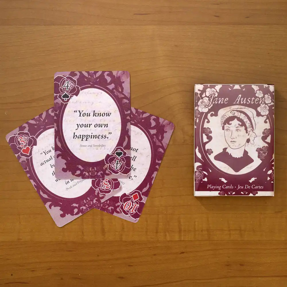 Jane Austen words continue to live on in these playing cards featuring quotes from the English novelist and skilled detective. This deck contains 52 cards and 2 jokers.
