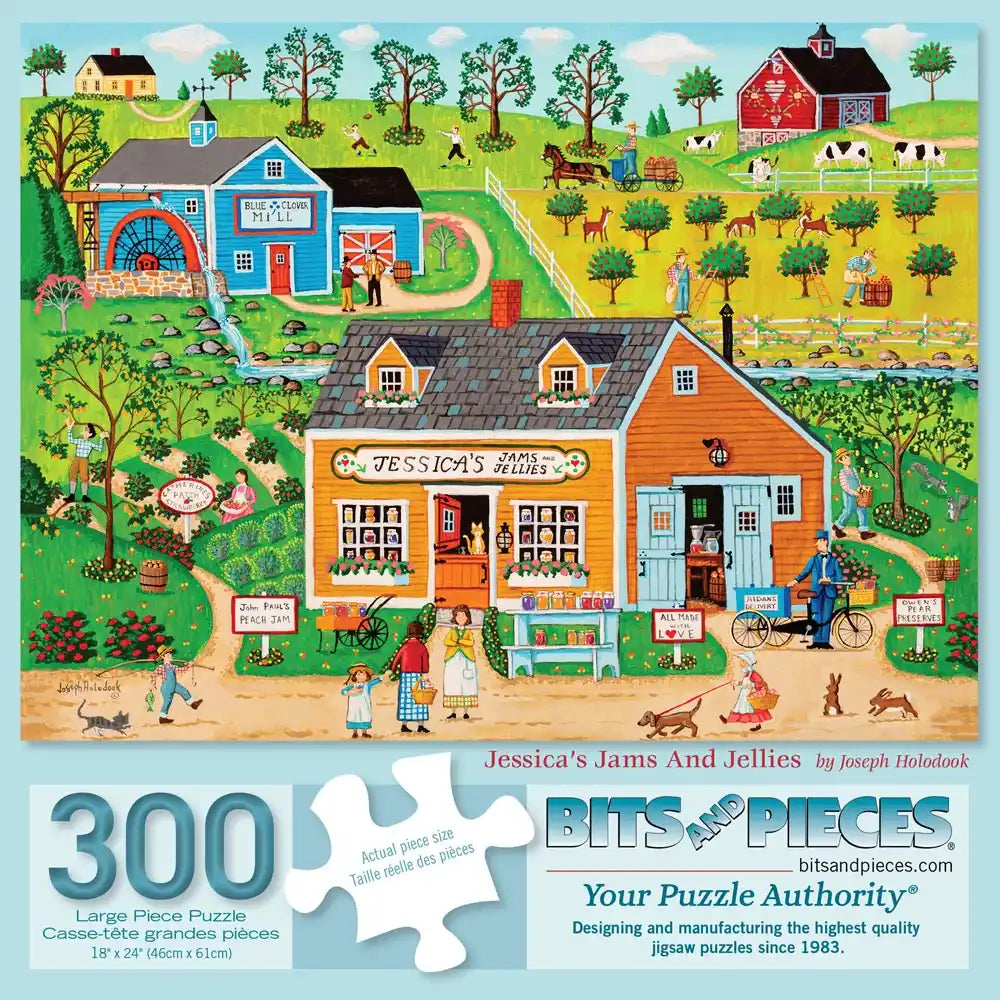 Step into a charming countryside scene captured by the brush of Jospeh Holodook. This jigsaw puzzle invites you to a quaint village store, a hub of sweet delights where every jar tells a story of summer's bounty. Perfect for an afternoon of family fun or a quiet moment of solitary relaxation. The artist's attention to detail is evident in every vibrant storefront and smiling face, promising a satisfying challenge as you piece together the bustling life around the village's favorite spot. The puzzle features a vibrant display of homemade preserves, each jar a tiny window into the heart of rural life. Available in two-piece counts. Puzzles consisting of 500 pieces are perfect for both intermediate puzzle enthusiasts and group activities.