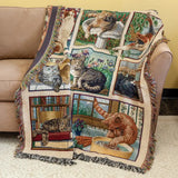 Cozy up with your favorite feline in this beautiful, rustic throw blanket. This soft, woven tapestry throw blanket shows 8 cute kitties purr-fect for cat lovers. Makes an adorable accent to your living space. Wash and dry on gentle cycle. 50" x 60". 100% cotton. Manufactured with imported yarns in the USA. Machine wash and dry.