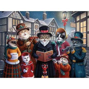 Kool-Kat Karolers Jigsaw Puzzle is a fun, festive holiday puzzle designed by Don Roth. It portrays a group of amusing carol-singing cats performing on a beautiful Christmas night.