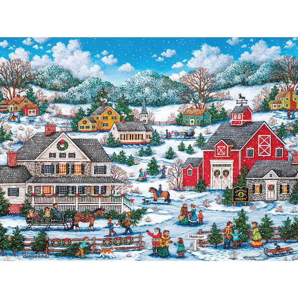 This jigsaw puzzle is designed by Bonnie White and available in multiple piece count. Puzzles are renowned for their engaging complexity, offering a satisfying challenge with their smaller, intricate pieces. Nestled in a charming town, this scene showcases a horse-drawn carriage, a snowy landscape, and the joyous tradition of selecting the perfect Christmas tree. Piece together the warmth and magic of the holidays in this delightful puzzle. Available in two piece count.