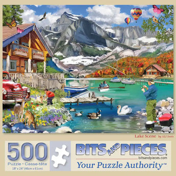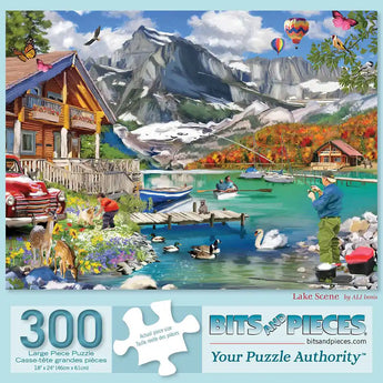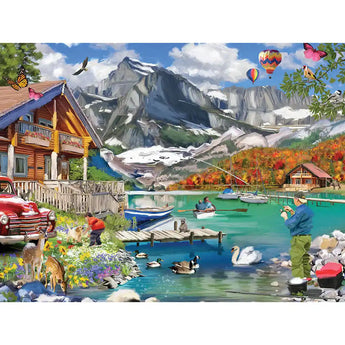 Enjoy a peaceful retreat with "Lake Scene," a beautifully illustrated puzzle by artist Ali Innis. This vibrant 300-piece puzzle features a lakeside cabin, fishing docks, playful wildlife, and scenic mountain views. Hot air balloons drift in the sky as boats float on the sparkling lake, creating a perfect blend of adventure and serenity. Measures 18" x 24" and is available in multiple piece counts to suit all skill levels.