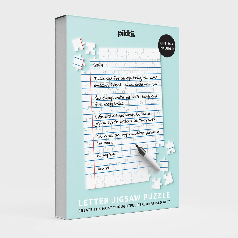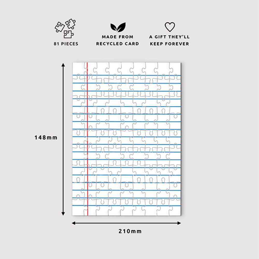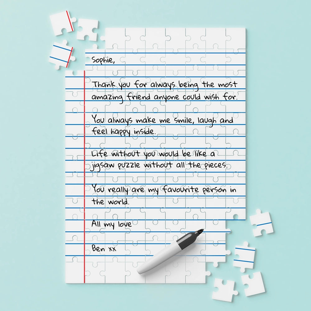 Add a personal twist to your next message. This blank, lined jigsaw puzzle lets you handwrite a note, love letter, or surprise message directly onto the puzzle surface with a pen or marker of your choice. Then, break it apart and place the 81 pieces into the included gift box for a heartfelt delivery with a fun twist. As they piece it together, your words will slowly come to life—making the reveal all the more memorable. Measures approximately 8.27" x 5.83" x 0.08". Not suitable for children under 3.