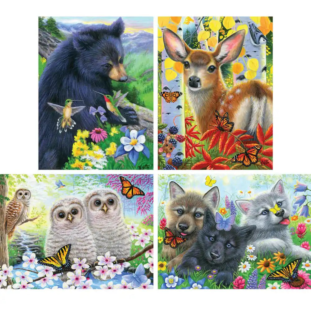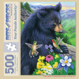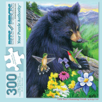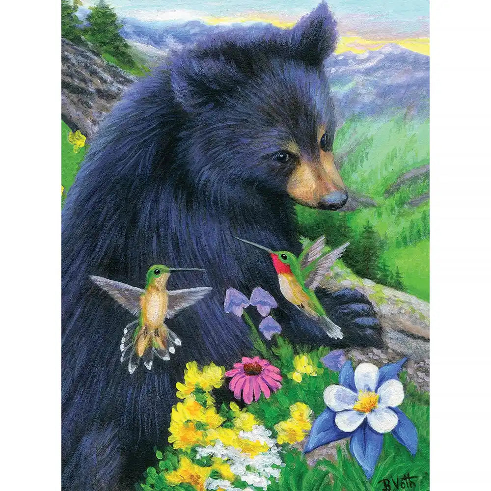 Step into a peaceful mountain meadow with Little Bear’s Humming Friends, a heartwarming puzzle designed by Bridget Voth. This charming scene features a curious black bear cub surrounded by colorful wildflowers and delicate hummingbirds. With its vibrant colors and gentle woodland setting, this puzzle is a delightful way to unwind and reconnect with nature. Available in multiple piece counts, including a 500-piece version that measures 18" x 24".