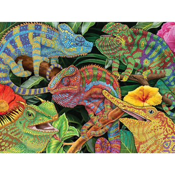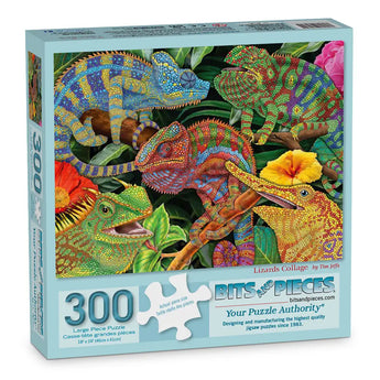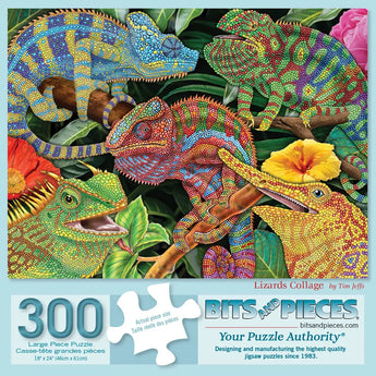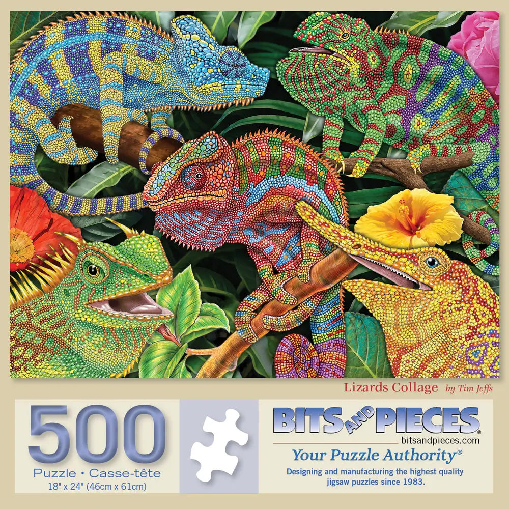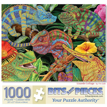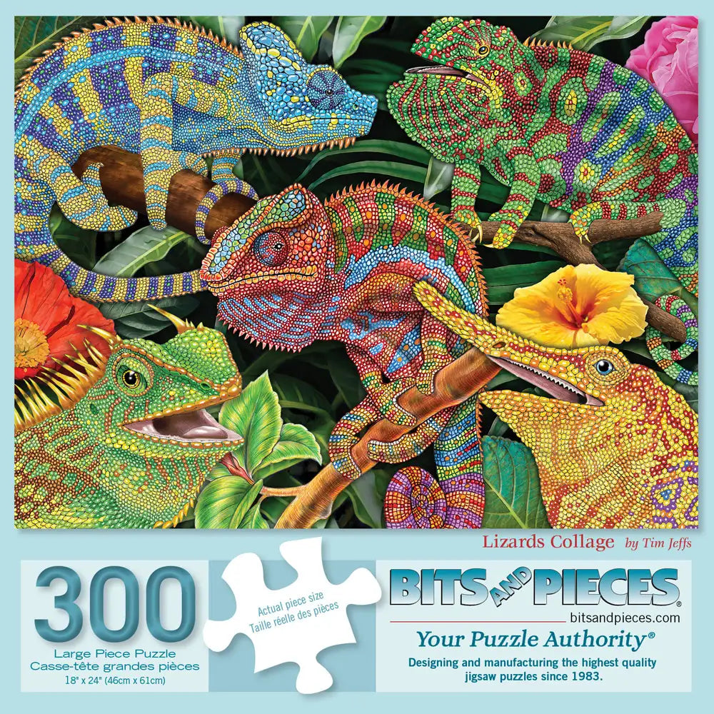 Celebrate the intricate beauty of nature with Lizards Collage by Tim Jeffs. This vibrant puzzle showcases a stunning array of colorful lizards, each detailed with mesmerizing patterns and textures. Nestled among lush tropical foliage and bright blossoms, the lively chameleons and other reptiles create a dynamic and fascinating scene. Perfect for wildlife lovers and art enthusiasts, this puzzle brings exotic beauty to life.