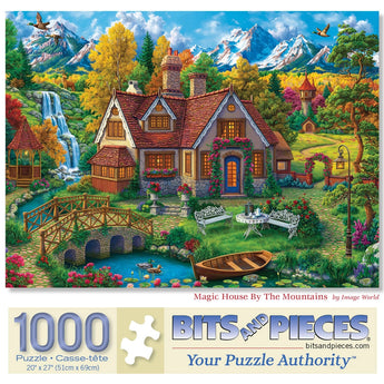 Step into a storybook setting with Magic House By The Mountains, a captivating puzzle designed by Image World. This charming cottage scene is nestled in a vibrant mountain landscape, complete with snowcapped peaks, waterfalls, and a blooming garden. A gentle stream winds through the lush grounds, adding to the serene atmosphere. Available in multiple piece counts, including this 300-piece large format puzzle measuring 18" x 24", it’s a delightful escape for puzzlers of all ages.