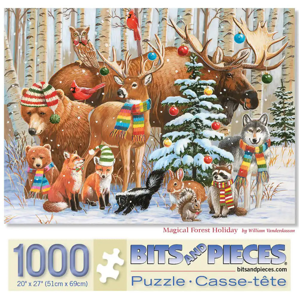 This jigsaw puzzle is designed by William Vanderdasson. Soft snow descends upon the forest, creating a tranquil setting for the woodland animals to come together and celebrate Christmas. A majestic moose, adorned with ornaments on its antlers, sets the festive backdrop. Other animals don hats and scarves, gathering around a small decorated tree. Available in multiple piece counts.