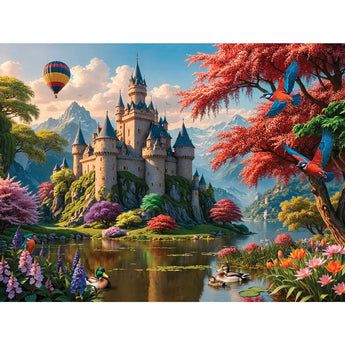 Step into a fairytale world with Majestic Reflections by Yuri Khrushch. This breathtaking puzzle features a grand castle perched on a lush hillside, its elegant towers mirrored perfectly in the tranquil waters below. Surrounded by vibrant trees, blooming flowers, and majestic mountains, the scene is alive with color and serenity. A hot air balloon floats gracefully in the sky, while vivid birds and peaceful ducks bring the scene to life. Perfect for dreamers and puzzle enthusiasts, this enchanting artwork invites you to piece together a storybook escape into beauty and wonder. Let the charm and splendor of Majestic Reflections take you away, one puzzle piece at a time!