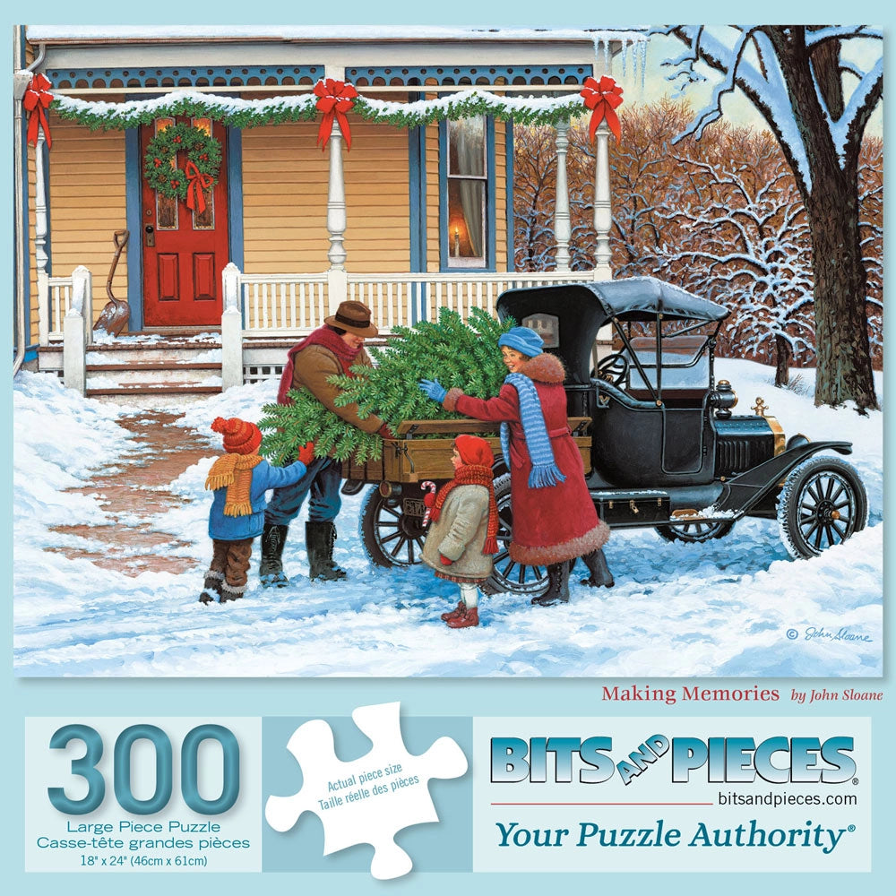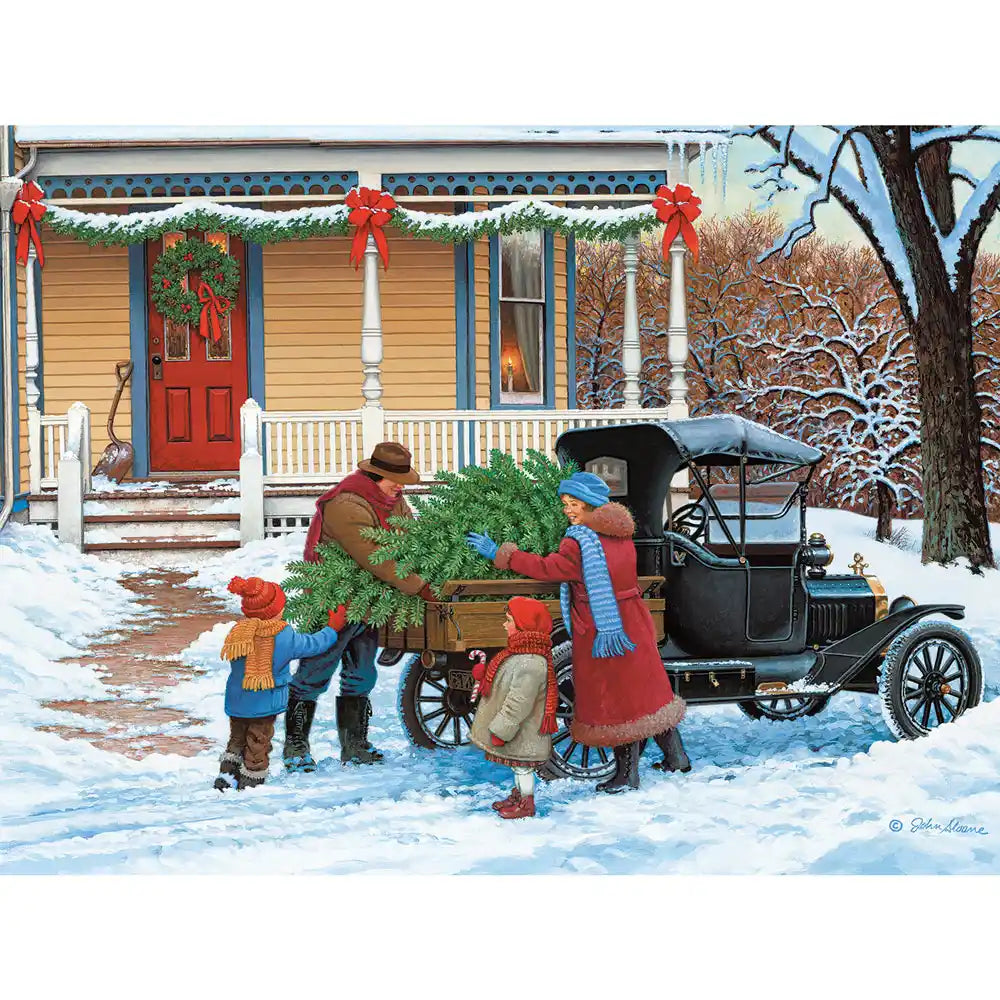 Capture the heartwarming joy of the holidays with Making Memories by John Sloane. This nostalgic scene showcases a family unloading a freshly cut Christmas tree from their vintage car, with children eagerly lending a hand. Garland-wrapped porch railings and a snowy backdrop set the perfect festive mood. Each piece of this puzzle evokes the warmth, laughter, and togetherness of a classic holiday tradition.