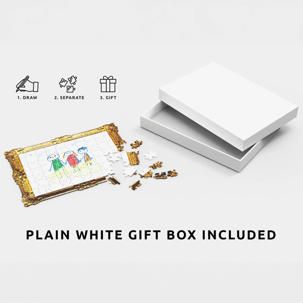 Turn your art into a heartfelt surprise! Use your favorite pens or pencils to draw a picture, doodle, or message on this blank, framed canvas jigsaw puzzle—then break it apart and tuck the 81 pieces into the included white gift box.Perfect for personalized presents, heartfelt notes, or creative keepsakes. The gift box is also blank, ready for your own written message. Completed puzzle measure 6" x 8-1/2" x3/4".Not suitable for children under 3 years.