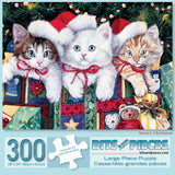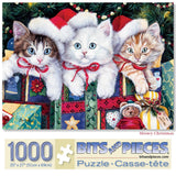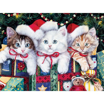 Celebrate the holiday season with Meowy Christmas, a heartwarming jigsaw puzzle designed by Jenny Newland. Three fluffy kittens, dressed in festive Santa hats and tied with red ribbons, peek out from a pile of brightly wrapped presents under a sparkling Christmas tree. Their playful expressions and cozy surroundings capture the magic and warmth of Christmas, making this puzzle a joy to assemble for the whole family.