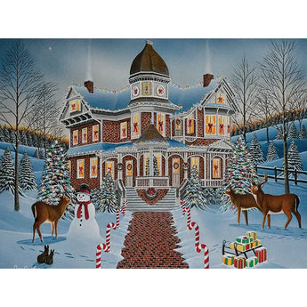 Step into a nostalgic winter wonderland with this charming jigsaw puzzle by Don Engler. Featuring a beautifully detailed Victorian home decorated for the holidays, this puzzle captures a magical snowy evening with glowing windows, candy cane-lined walkways, curious deer, and a jolly snowman. With its classic Americana style and heartwarming details, this puzzle makes a delightful seasonal challenge for families and collectors alike.
