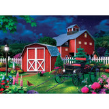 Step into a peaceful countryside evening with this 1,000-piece jigsaw puzzle by artist Alan Giana. The scene features a charming red barn and carriage surrounded by lush gardens in full bloom, glowing under a starlit sky. A white picket fence, mountains in the distance, and delicate butterflies and flowers add warmth and detail to this idyllic setting. Perfect for puzzlers who love tranquil landscapes and rich color palettes, this puzzle is both relaxing and rewarding to complete. This puzzle measures 19.25" x 26.75".