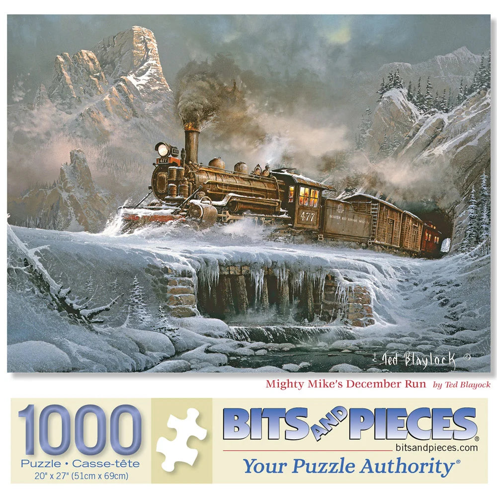 Ted Blaylock’s Mighty Mikes December Run powers through snow-covered tracks, steam swirling against a backdrop of rugged peaks. A dynamic train jigsaw puzzle perfect for winter nights and railroad enthusiasts.