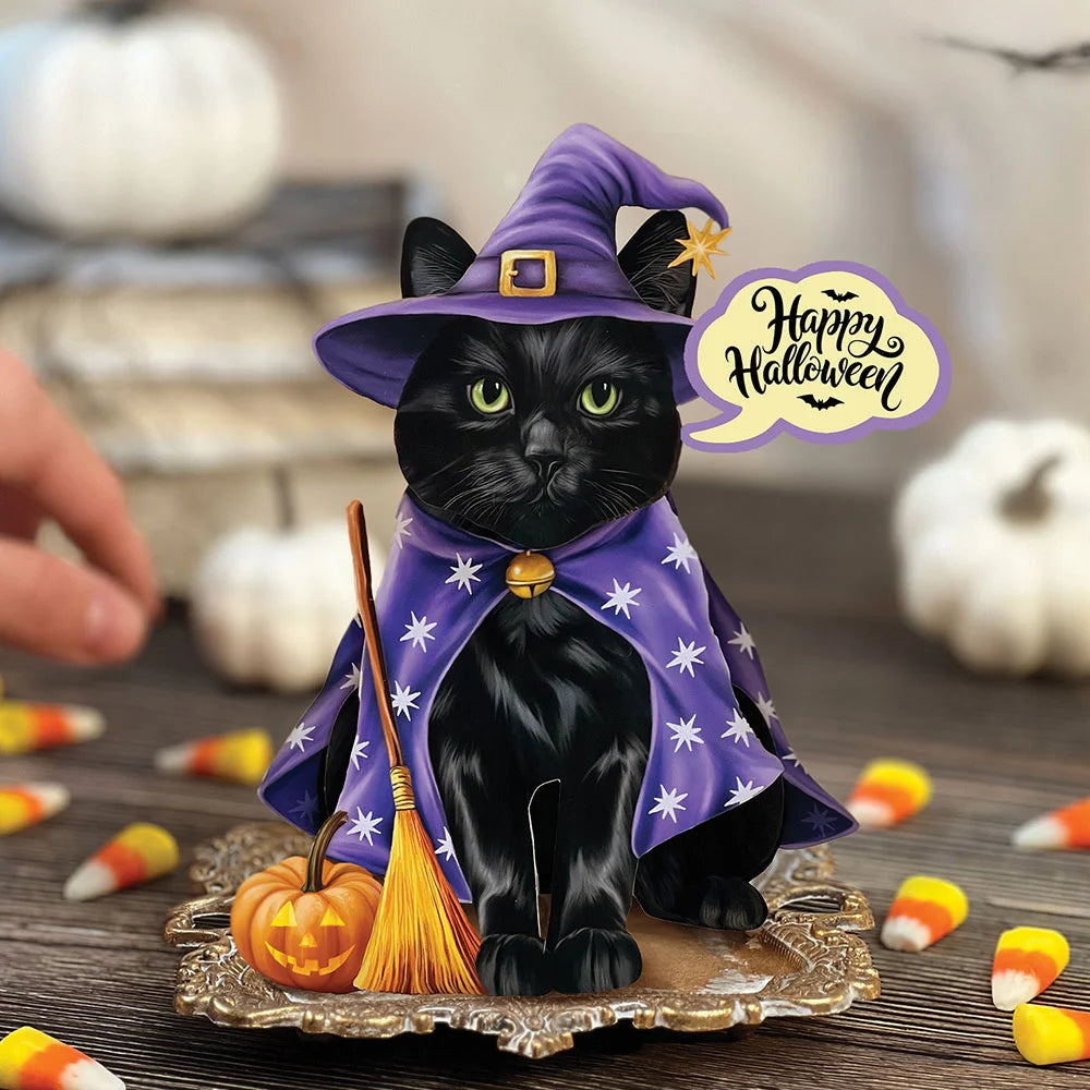 Celebrate the season with a pop-up card full of feline charm! This delightful 3D scene stars an irresistibly festive kitty dressed in a starry witch’s hat and cloak. It opens to approximately 5.25" high by 4.5" across and includes a matching note card for your personal message. A purr-fect way to share holiday magic.