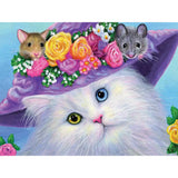 This jigsaw puzzle is designed by Bridget Voth . The Persian cat with two different colored eyes poses with a large purple hat. On top of the hat she has a large bunch of flowers with mice peering out. Available in two piece count.
