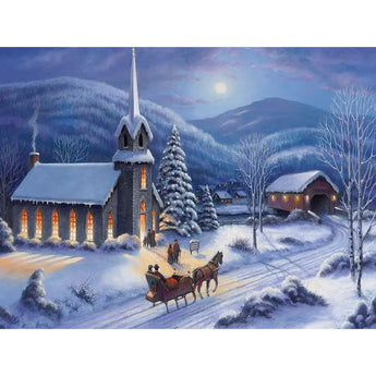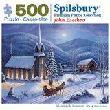 This 500 piece jigsaw puzzle is designed by John Zaccheo and measures 18" x 24". The horse pulls a carriage through the snow that is illuminated by the bright moon. Available in two piece count.