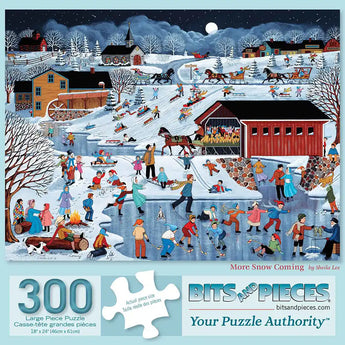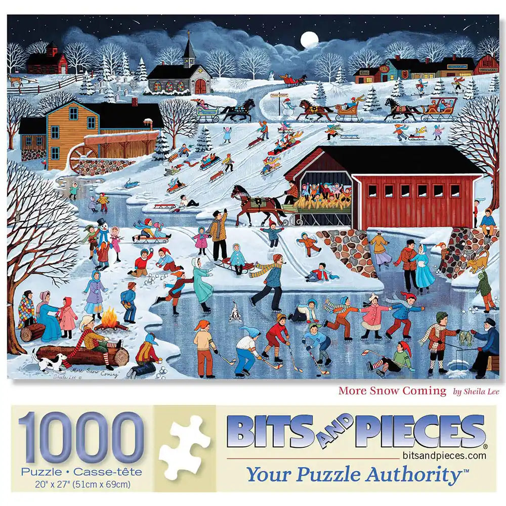 Celebrate winter fun with "More Snow Coming," a delightful puzzle by Sheila Lee. This nostalgic winter scene brims with activity as families skate, sled, and enjoy the snowy countryside. From the glowing lanterns to the charming covered bridge, each piece captures the magic of a classic winter's day. Perfect for creating cozy holiday memories while puzzling!