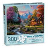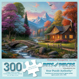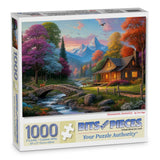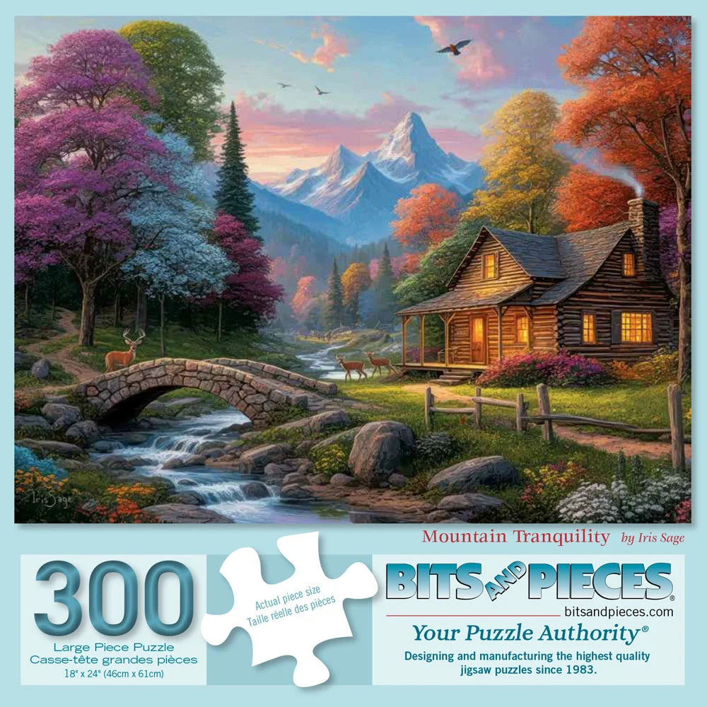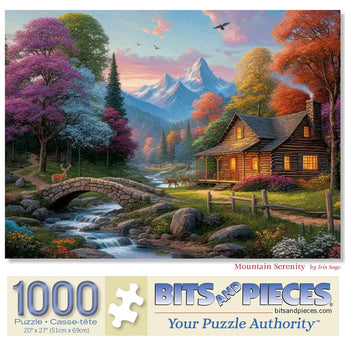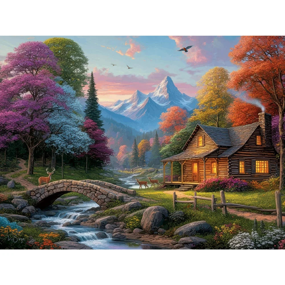 Escape to the peaceful wilderness with Mountain Serenity by Iris Sage. A cozy log cabin glows with warm light, nestled among vibrant autumn trees and snow-capped peaks. A stone bridge arches over a gentle stream, where deer pause to drink while birds soar overhead. With every piece, you’ll feel the crisp mountain air and hear the soft rustle of leaves—nature’s perfect retreat, one puzzle piece at a time.