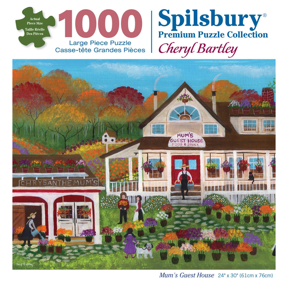 Step into the charm of Cheryl Bartley's "Mum's Guest House," where vibrant autumn hues and cozy hospitality come together. This beautifully detailed puzzle captures a quaint guest house surrounded by blooming mums and serene countryside views.