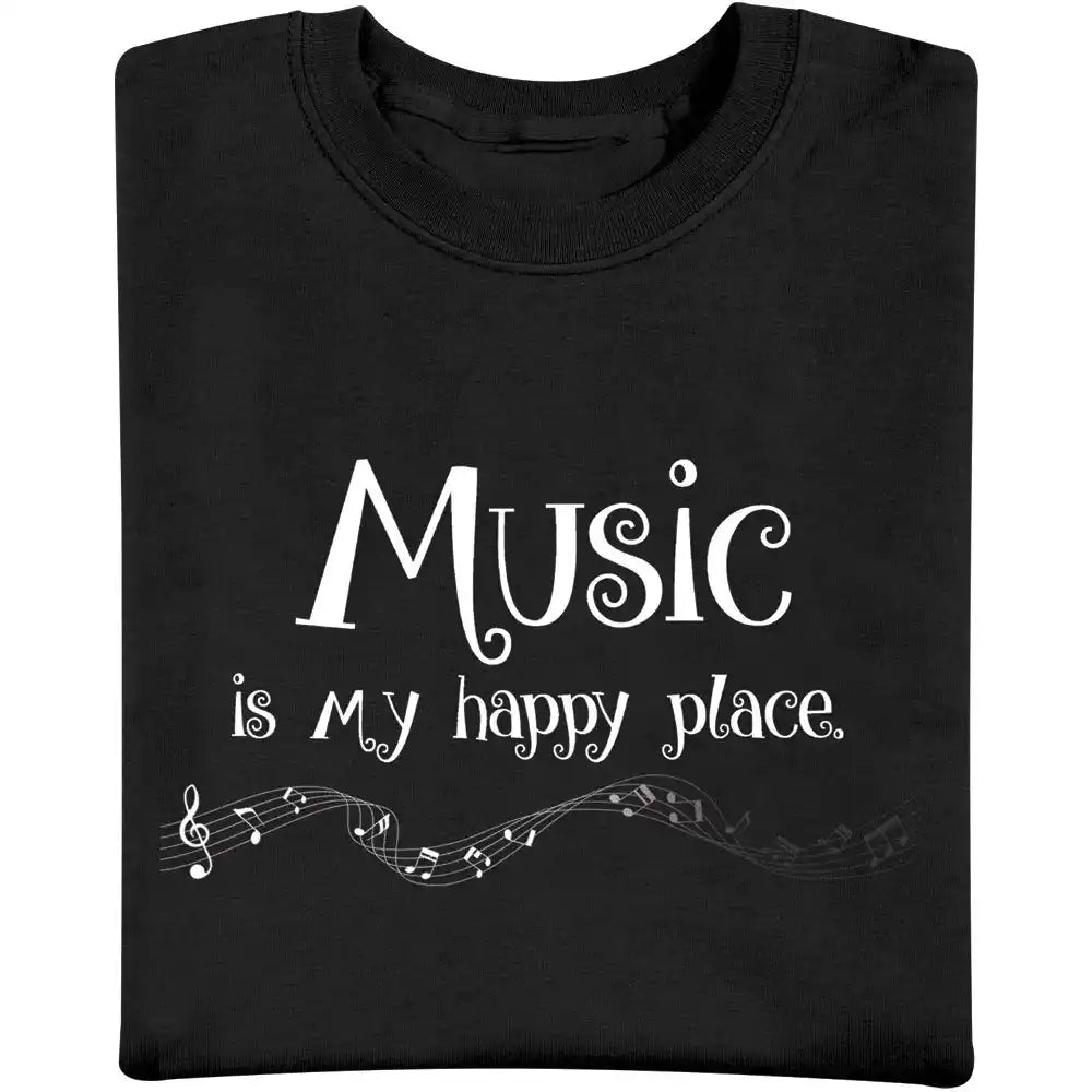 Turn up the good vibes with the Music Is My Happy Place T-shirt — a must-have for anyone who finds joy in every note. This black, short-sleeved crew neck is made from 100% soft cotton for a breathable, all-day comfortable fit. Whether you're playing an instrument, grooving at a concert, or just jamming out at home, this tee proudly shares your passion for music. Machine washable and easy to care for, it’s the perfect gift for music lovers of all kinds.