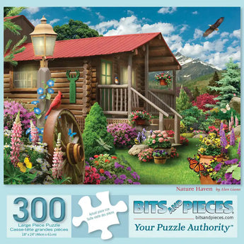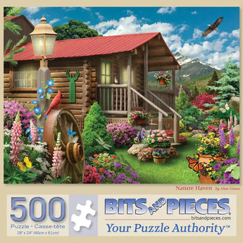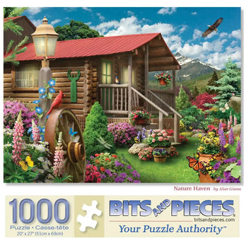 Get away from it all with Nature Haven by Alan Giana. This picturesque cabin scene features a rustic lodge nestled among lush gardens and vibrant flowers, creating a peaceful retreat perfect for nature lovers.