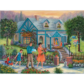 Step into a picturesque countryside gathering with Christine Carey’s beautifully detailed 1,000-piece puzzle. This charming scene captures a warm and welcoming moment as a family arrives at a storybook cottage, bringing flowers and a homemade dessert. The lush garden, filled with vibrant flowers, stone pathways, and towering trees, creates a peaceful setting. Children play in the yard, a dog watches from the gate, and birds flutter near charming birdhouses, adding to the tranquil, nostalgic feel of this delightful artwork.