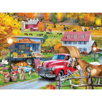 Experience the vibrant charm of autumn with the New England Fall Farm jigsaw puzzle by Ali Innis. This delightful jigsaw puzzle showcases a picturesque countryside scene, complete with a red barn, a cozy farmhouse, and a quaint roadside stand filled with fresh produce and pumpkins. A classic red pickup truck and grazing horses add to the rustic charm, while the golden hues of fall foliage bring the scene to life. Perfect for lovers of the season and countryside settings, this puzzle offers a relaxing and rewarding activity for all ages.