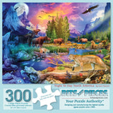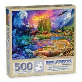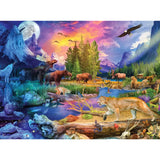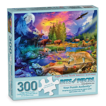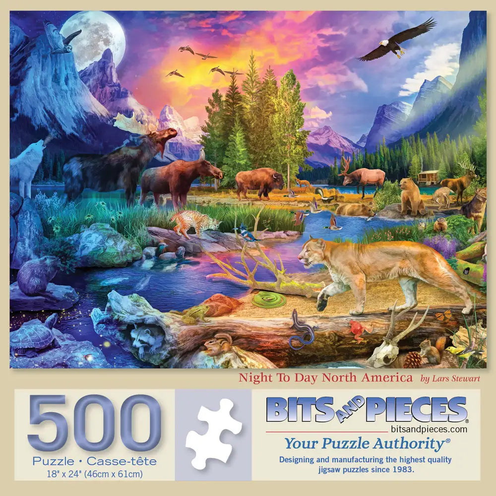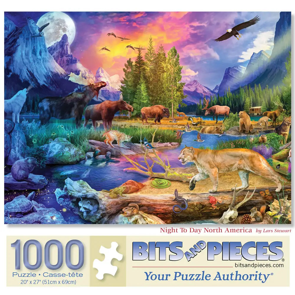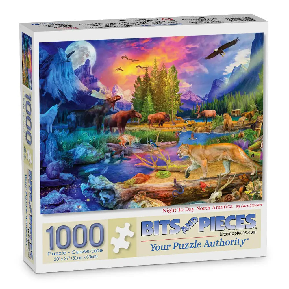 Explore the wild beauty of North America with Night to Day North America by Lars Stewart. This captivating puzzle takes you on a journey through a stunning wilderness where the moonlit night transforms into the vibrant light of dawn. Majestic animals such as wolves, bears, moose, and mountain lions roam the landscape; while soaring eagles and grazing bison complete the scene. Set against towering mountains, rushing rivers, and lush forests, this artwork celebrates the untamed beauty of nature from dusk to dawn. Perfect for nature enthusiasts and puzzle lovers, this scene immerses you in the spirit of North America’s wildlife. Journey through North America’s wilderness from moonlight to sunrise, one puzzle piece at a time!