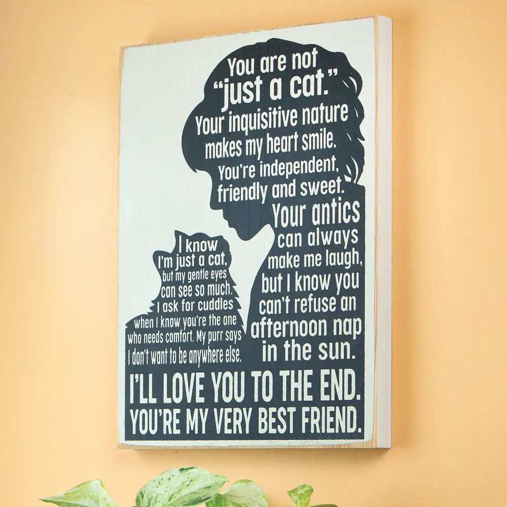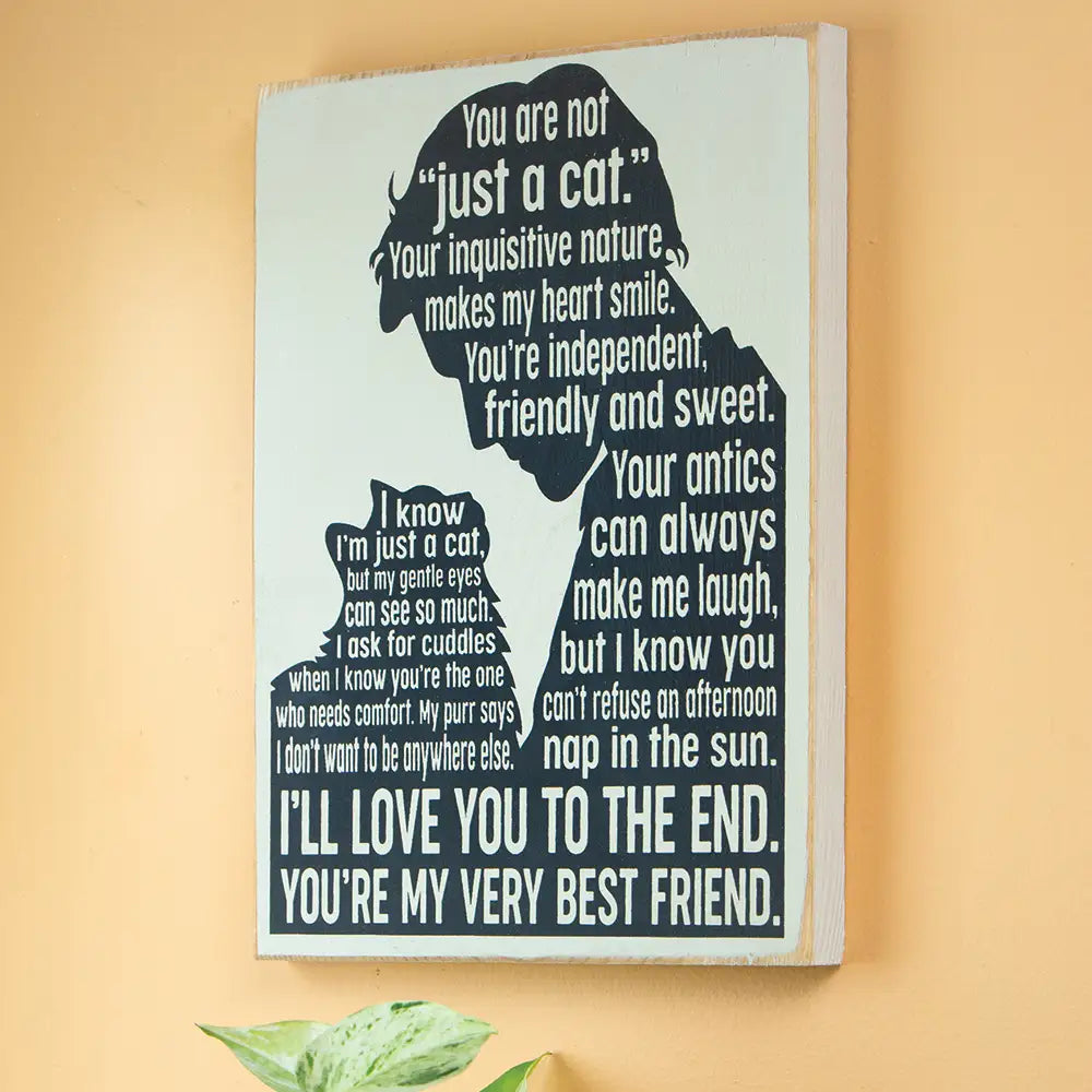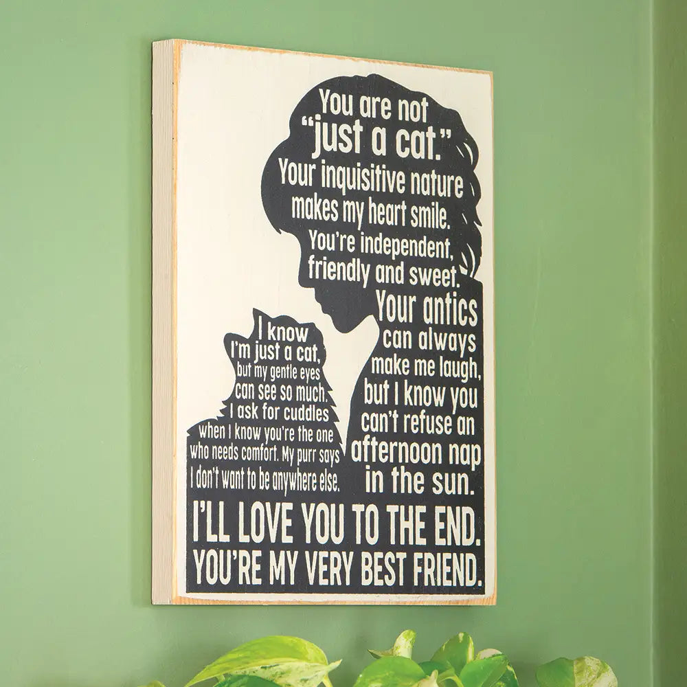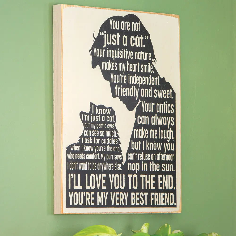 More than just a pet, your cat is a member of your family. On this beautiful knotty pine plaque, a cat and its owner exchange heartfelt sentiments, both ending with “I’ll love you to the end. You’re my very best friend.” Solid knotty pine. 12" long x 9" wide.