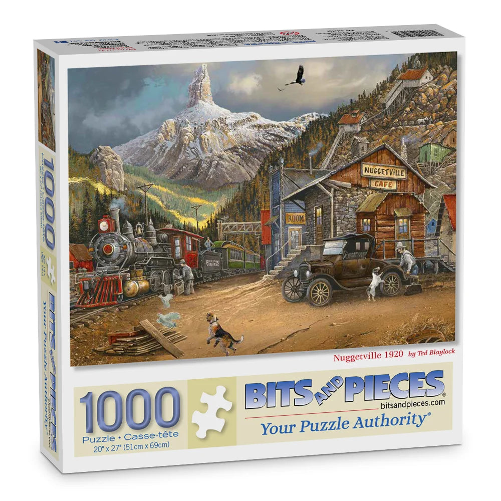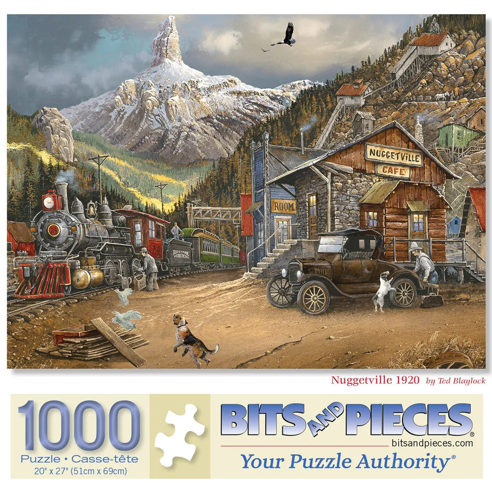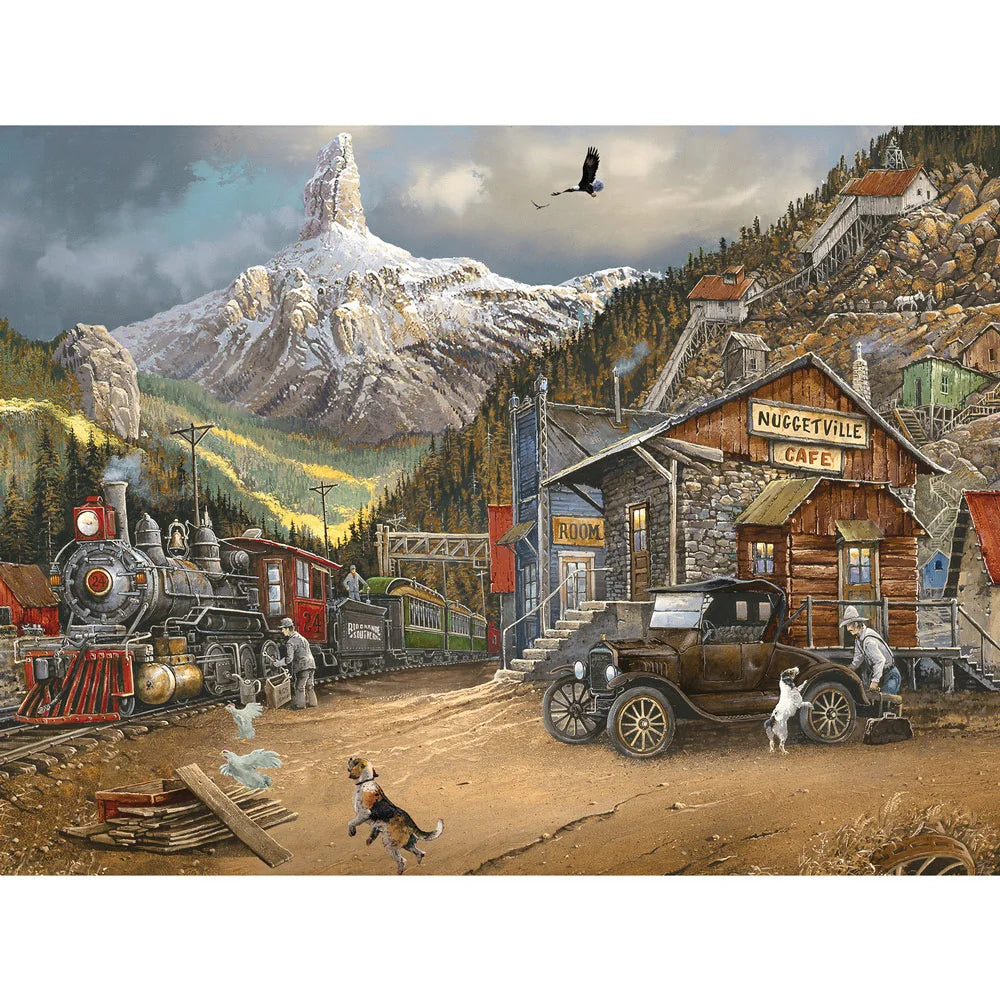In Nuggetville 1920, Ted Blaylock transports you to a lively mining town where steam trains and early automobiles share the dusty streets. Majestic peaks rise in the background, creating a captivating railroad puzzle filled with Old West character.