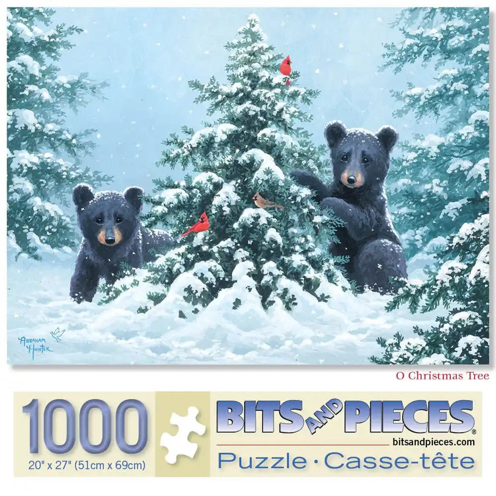 O Christmas Tree is designed by artist Abraham Hunter. Two black bear cubs frolic near a Christmas tree in the forest. The tree is heavy with newly fallen with snow and cardinals perch on its evergreen branches. Available in two-piece counts.