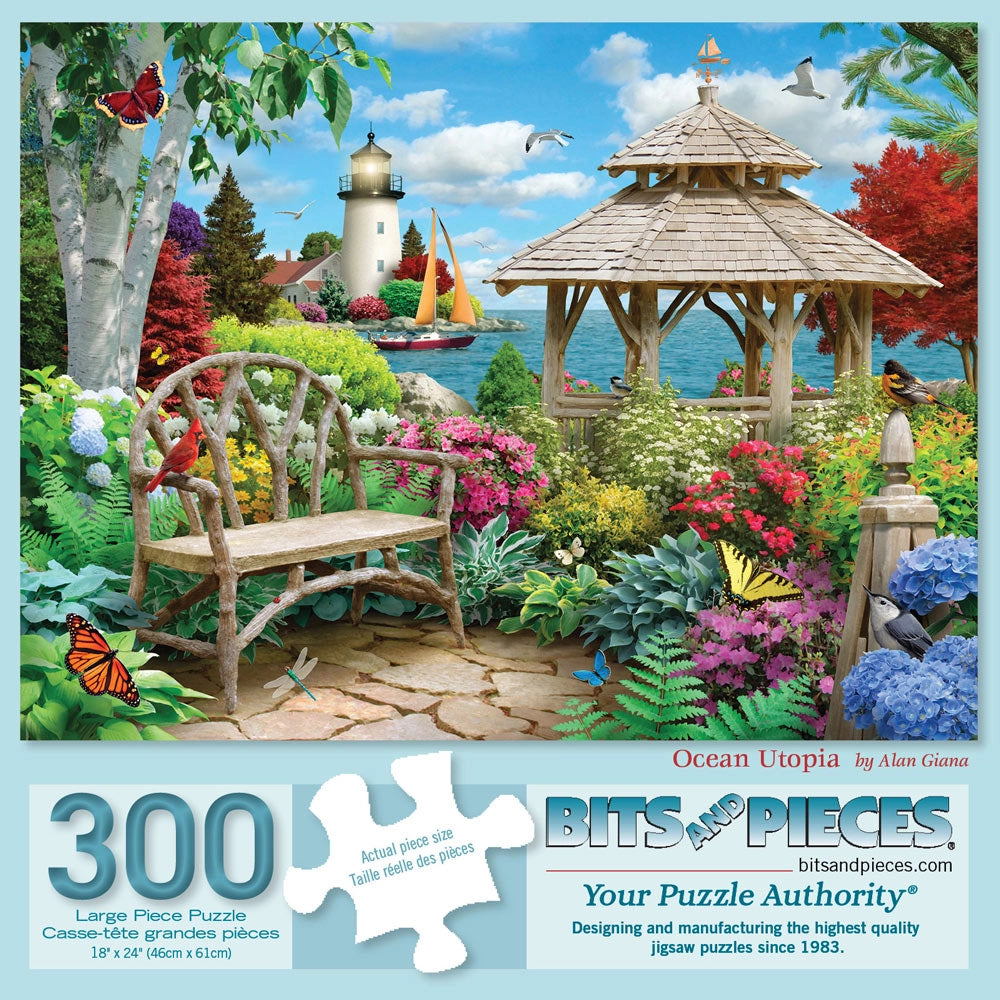 Escape to a serene coastal paradise with our Ocean Utopia, featuring the exquisite artwork of Alan Giana. This picturesque scene invites you to a peaceful shoreline where a charming lighthouse stands tall, guiding a sailboat that glides across the calm waters. A cozy gazebo offers a perfect spot to relax, while a nearby bench provides a front-row seat to the beauty of the ocean. With lush greenery and vibrant flowers surrounding the scene, this jigsaw puzzle captures the essence of coastal tranquility and offers a delightful escape from the everyday.