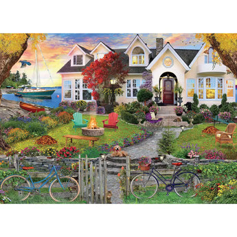 Step into a coastal dream with Oceanside Living 1000 Piece Jigsaw Puzzle by David MacLean. A charming beachside cottage, colorful Adirondack chairs by the fire, and sailboats drifting in the distance set the perfect seaside scene. Bicycles wait by the garden gate, ready for a ride along the shore. Lush flowers, rippling water, and a golden sunset make this puzzle a relaxing and joyful retreat for anyone who loves the ocean breeze.Designed by David Maclean. Puzzles consisting of 1,000 pieces are renowned for their engaging complexity, offering a satisfying challenge with their smaller, intricate pieces.
