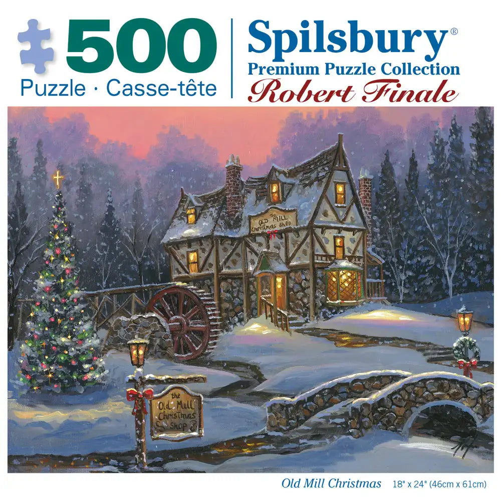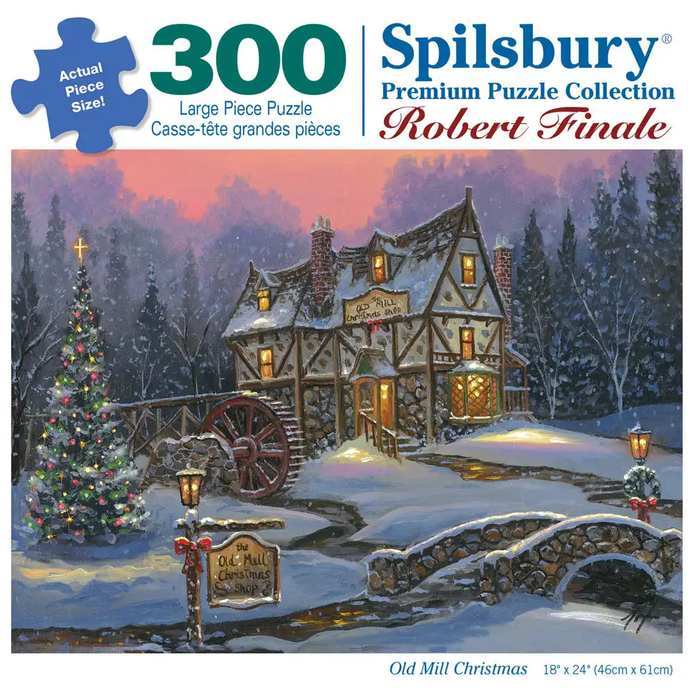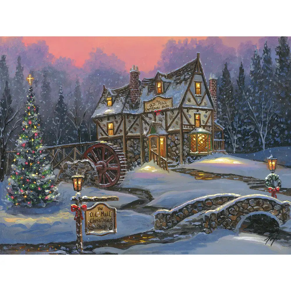 Step into a snow-dusted twilight at the Old Mill Christmas Shop, where warm lamplight and fresh snowfall create a magical holiday moment. Old Mill Christmas is by Robert Finale that invites you to linger in the stillness and charm of a Christmas evening by the fire. Available in two-piece counts.