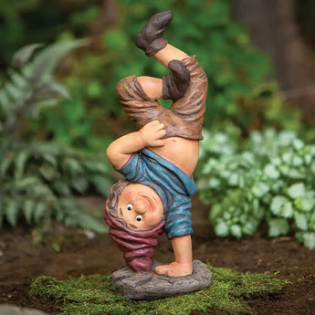 Our clever elf is showing off his fun-loving skills by magically balancing on one hand assisted by his pointed red hat. An adorable and unexpected, whimsical addition to your porch, yard or garden. Made of weather resistant polyresin and hand painted with realistic details and texture. Measures 12-3/4" x 3-3/4" x 5".