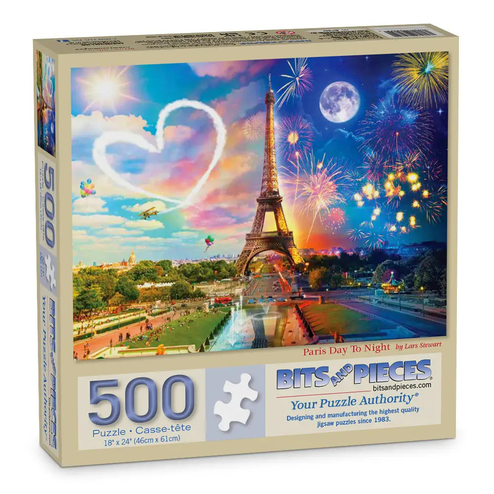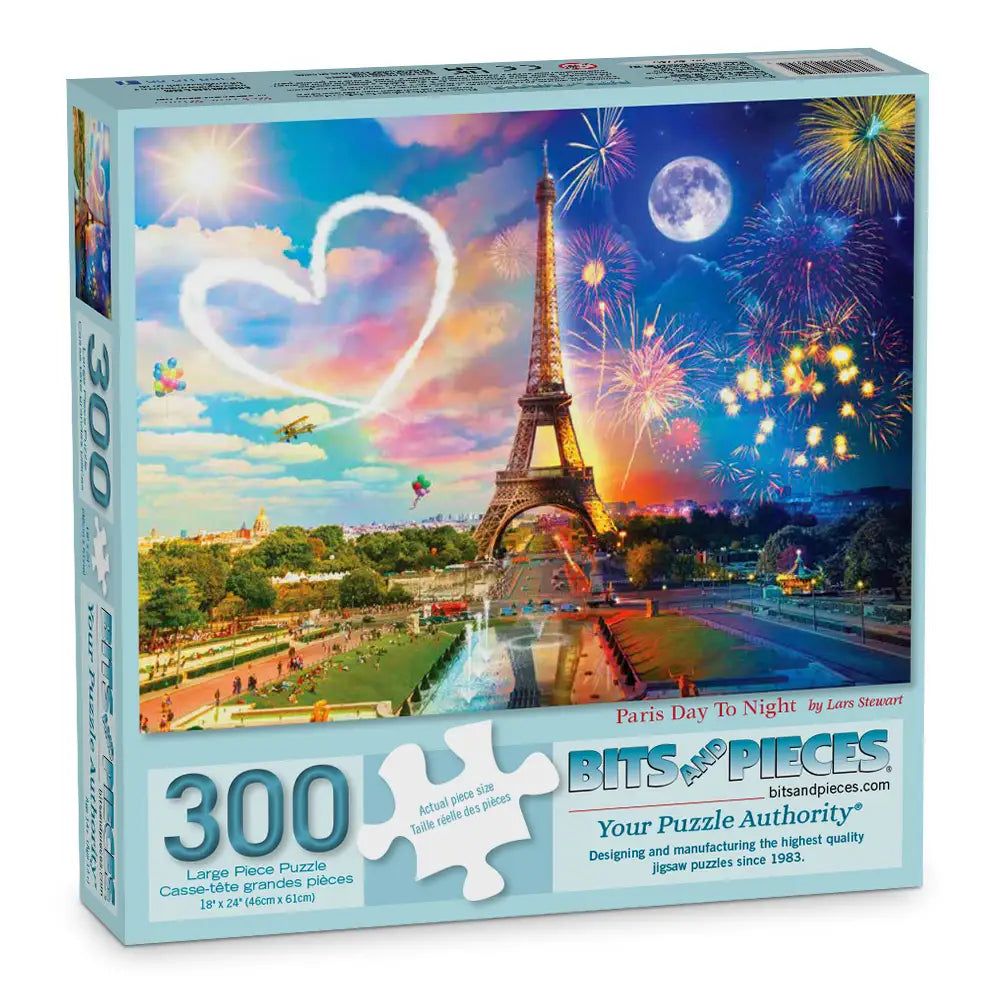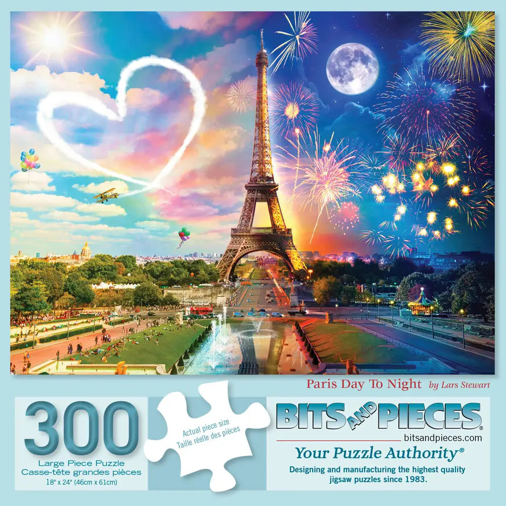 Experience the magic of Paris like never before with Paris Day to Night by Lars Stewart. This stunning puzzle highlights the Eiffel Tower amidst a breathtaking transformation from the sunny vibrancy of daytime to the dazzling fireworks of a starlit evening. Whimsical heart-shaped clouds, colorful balloons, and sparkling fountains add a touch of romance to this iconic cityscape. Celebrate the City of Light’s timeless charm as you piece together this captivating masterpiece that brings Paris to life, from dawn to dusk and beyond. Bring the romance and magic of Paris into your home, one puzzle piece at a time!